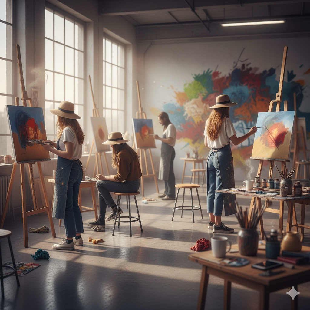 In dieser inspirierenden Atmosphäre biete ich dir den Raum, den Alltag hinter dir zu lassen und unter meiner Anleitung in die Welt der Farben einzutauchen. Da die Werkstatt ein Gemeinschaftsort für viele kreative Köpfe und verschiedene Workshops ist, profitierst du hier von einer voll ausgestatteten, professionellen Umgebung.
